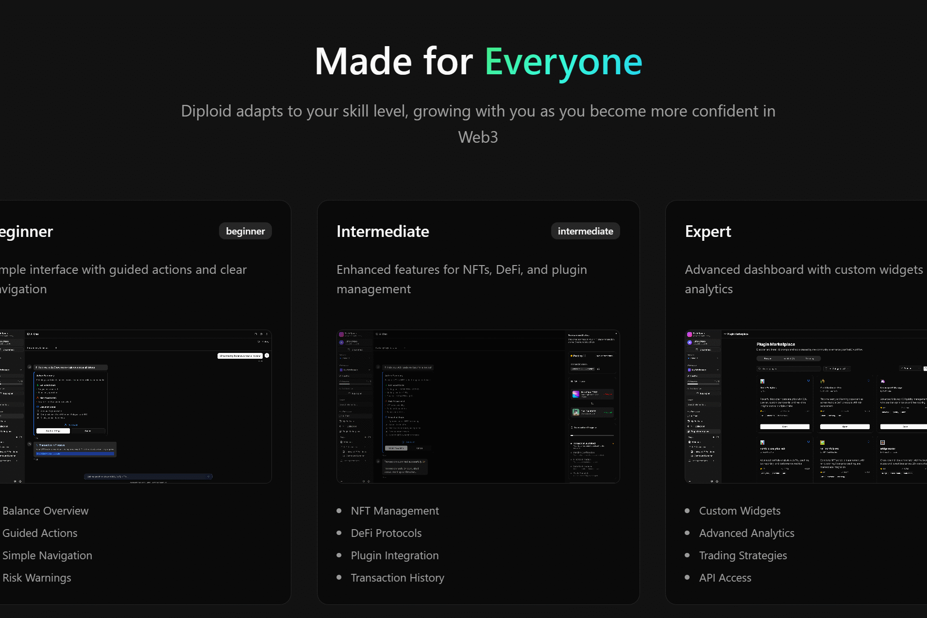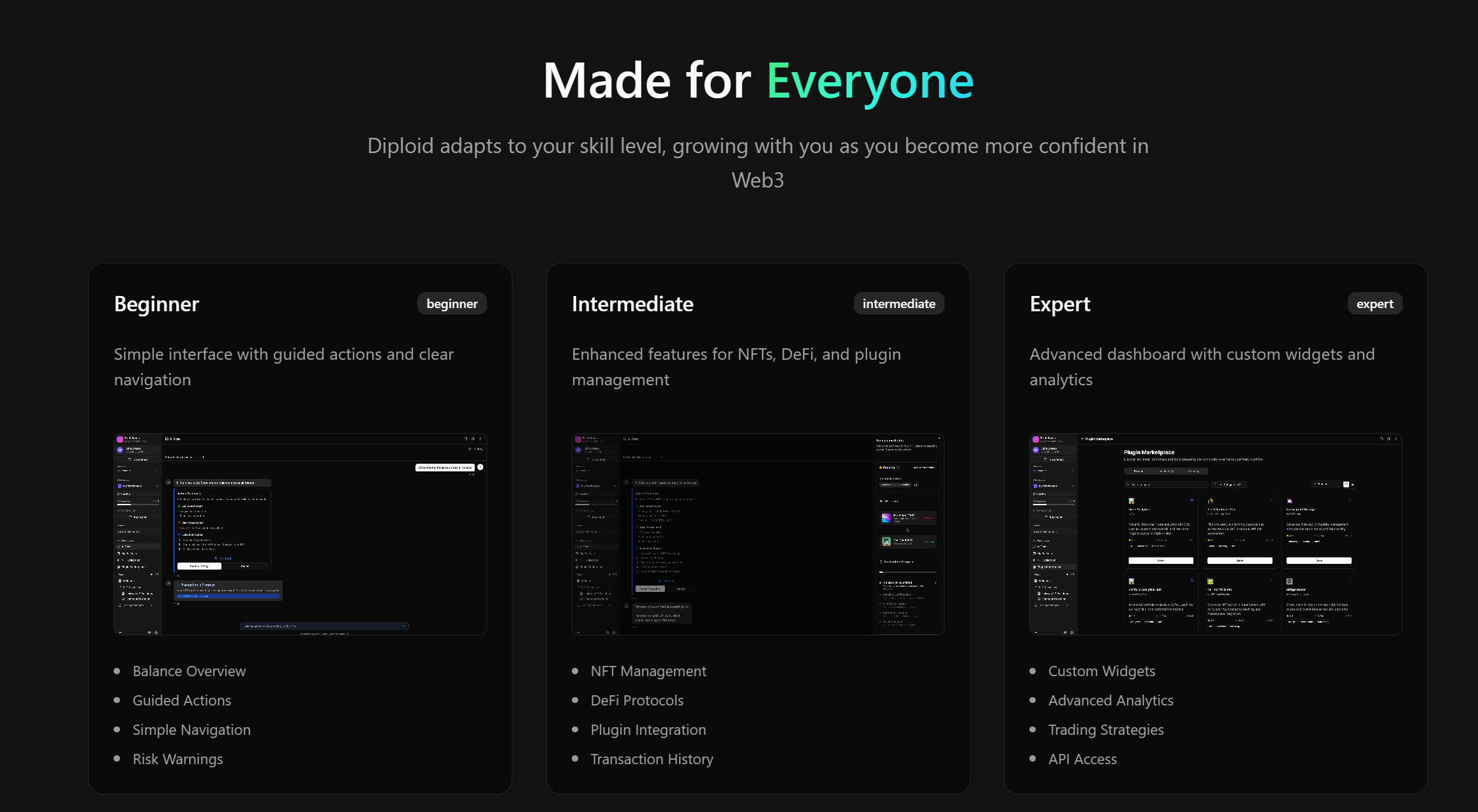 Diploid is an all in one AI powered platform designed to make the world of Web3 simple, secure, and accessible for everyone, from complete beginners to experienced crypto users, creators, teams, and institutions. While Web3 promises a new era of digital ownership and financial empowerment, it is often seen as too complicated, risky, and fragmented. Many people are interested in blockchain, digital assets, and decentralized finance (DeFi), but struggle with confusing tools, technical jargon, and a lack of trust. Diploid exists to solve these problems by reimagining the Web3 experience for the masses, enabling an agentic Web3 that gives users real control, confidence, and clarity.